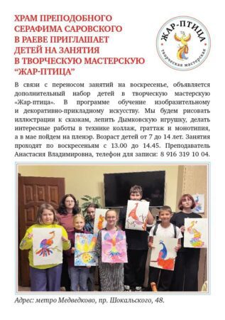 В связи с переносом занятий на воскресенье, объявляется дополнительный набор детей в творческую мастерскую «Жар-птица» при храме преподобного Серафима Саровского в Раеве (пр. Шокальского, 48).