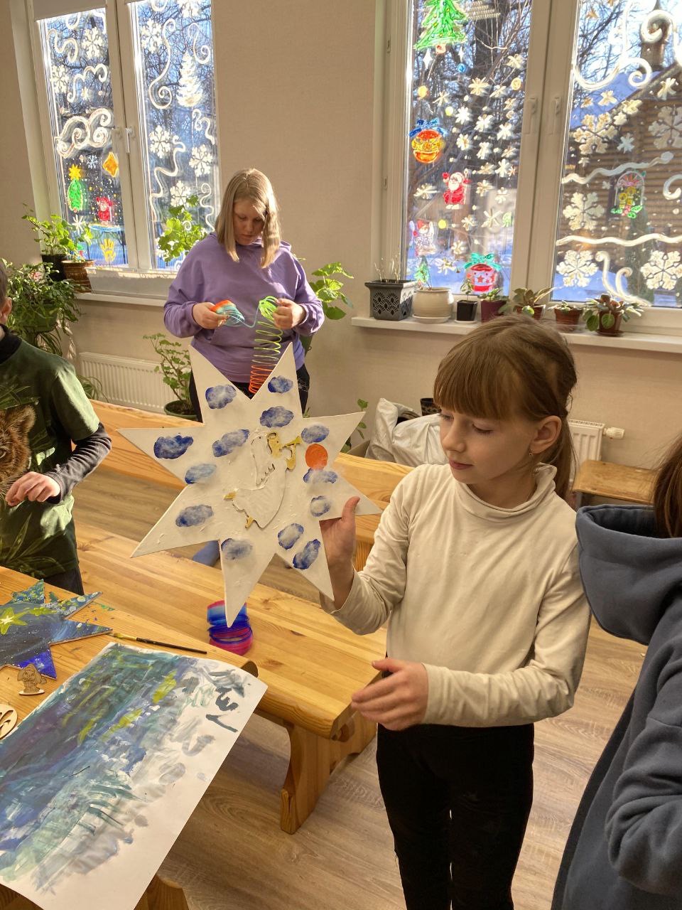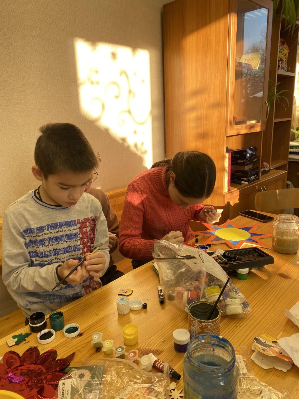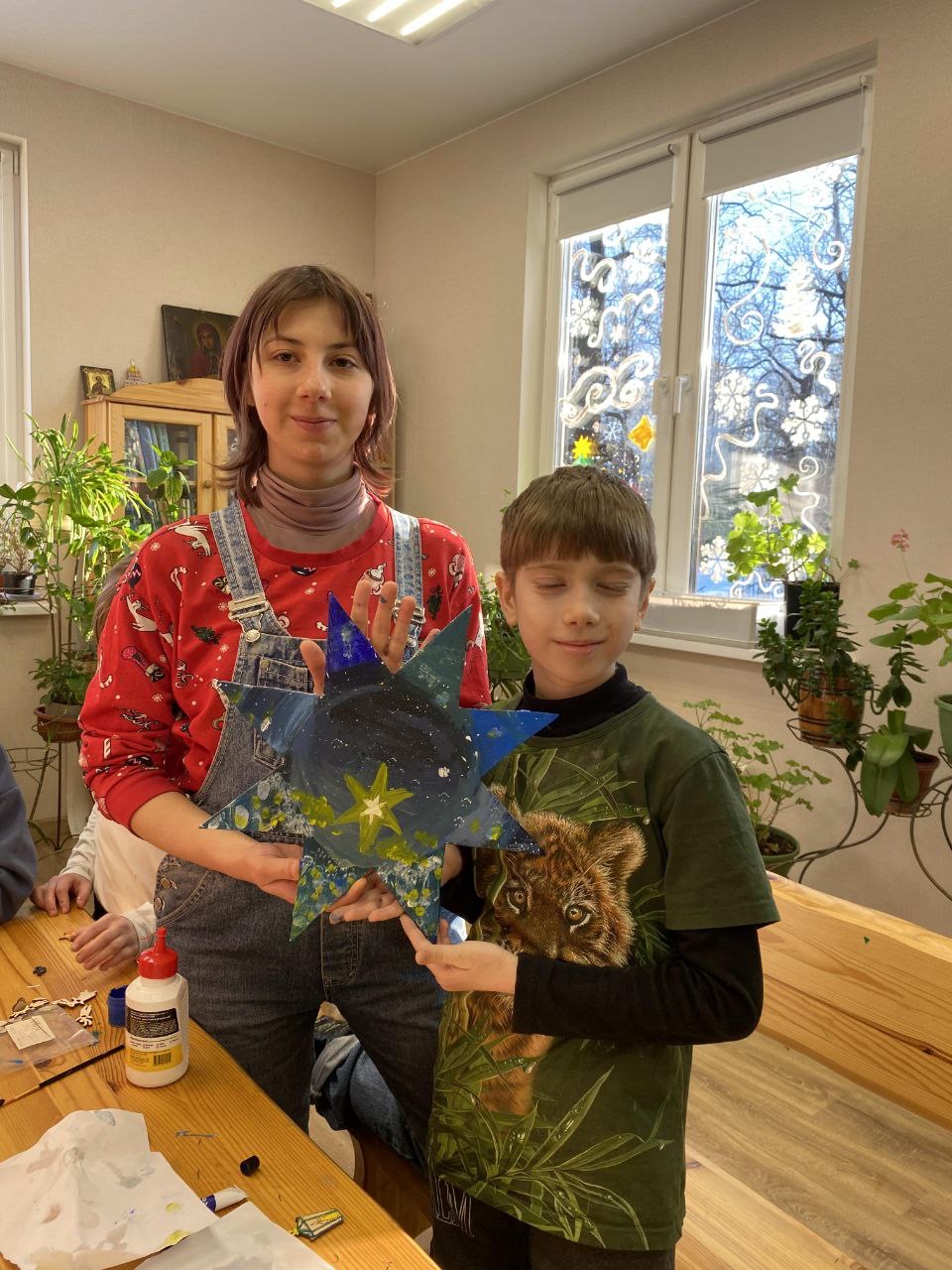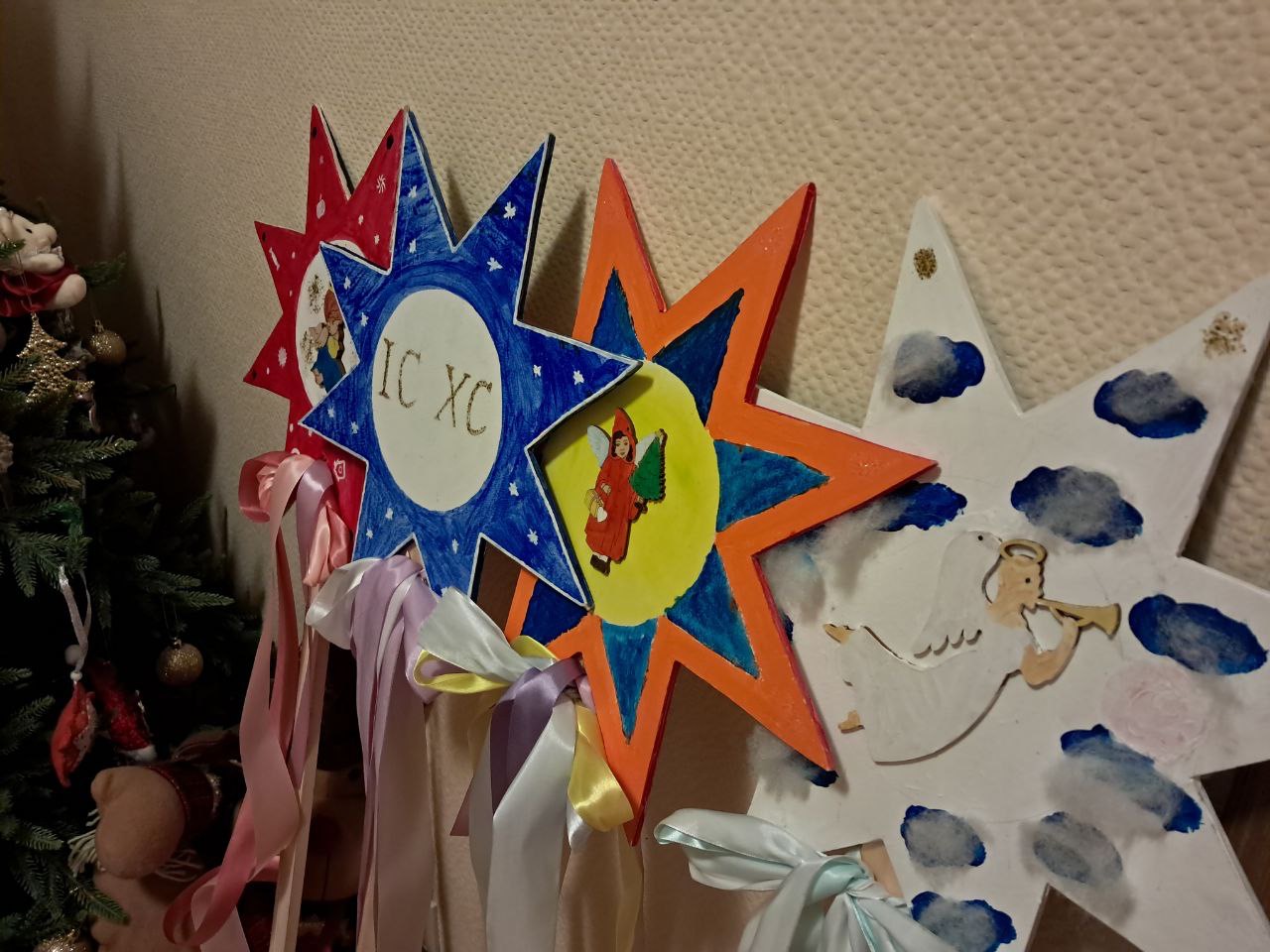 Во время занятия ребята будут создавать нарядные звезды. Заготовки нужно будет раскрасить красками, нанести блёстки, закрепить иконочку Рождества Христова.