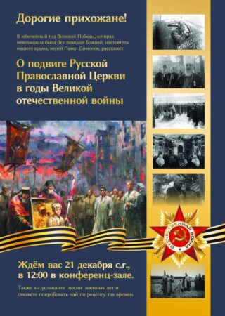 21 декабря 2025 года в 12:00 в конференц-зале храма Собора Московских Святых в Бибиреве состоится беседа настоятеля храма о подвиге Русской Православной Церкви в годы Великой Отечественной войны.