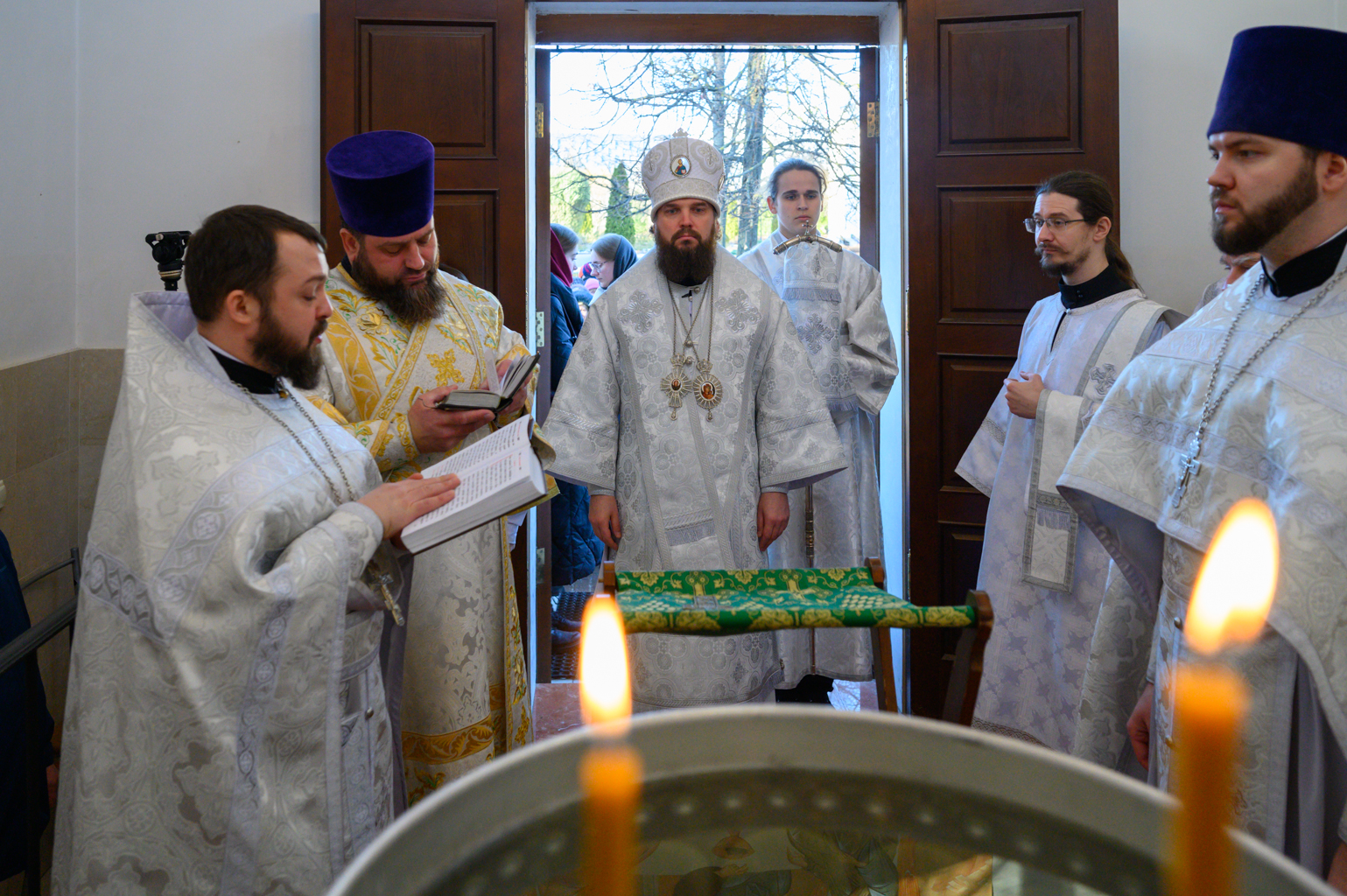 После отпуста духовенство во главе с архипастырем и прихожане крестным ходом направились во двор усадьбы к часовне Воздвижения Честного Креста Господня. По прочтении молитвословий было совершено великое освящение воды, после чего владыка Арсений окропил агиасмой всех молящихся.