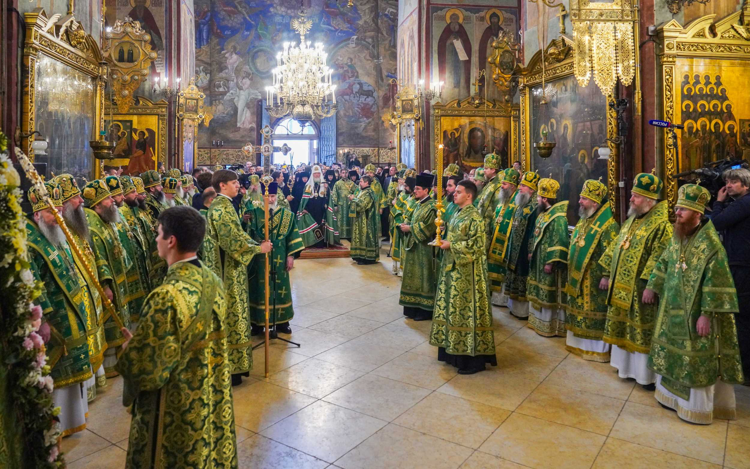 За Литургией Его Святейшеству сослужили сонм архиереев Русской Православной Церкви, в числе которых был управляющий Северо-Восточным Московским викариатством митрополит Звенигородский Арсений, а также насельники Троице-Сергиевой лавры в священном сане; духовенство г. Москвы.