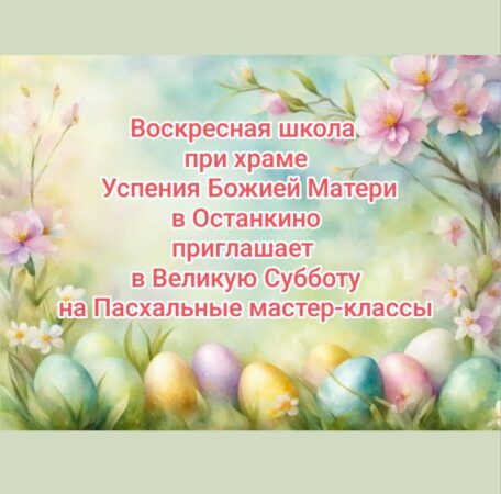 В Великую Субботу, 11 апреля 2026 года, в воскресной школе при храме Успения Пресвятой Богородицы, Патриаршего подворья в Останкине во время освящения пасхальной снеди будут проходить различные мастер-классы по созданию украшений к Пасхе.